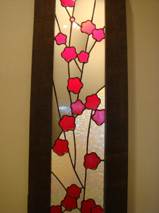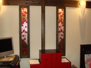 「梅の柄」は、コシノジュンコの振袖の柄(神田うのちゃん着用)をモチーフにしました。このデザインを使わせていただくために南青山のコシノ先生のオフィスに許可をとるなど、とても大変でしたが、先生も前の店でのこのステンドグラスを覚えていらして、新しくこの店をオープンし記念パーティーに来て頂いた時にも「あら、このステンドグラス持ってきてくれたんだ」と喜んでくださいました。