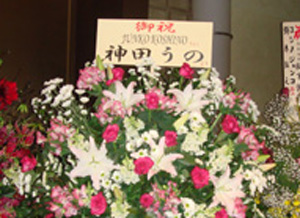 昨年12月、コシノ先生がご夫婦でイタリアの文化勲章「なんとか賞」(スミマセン。忘れました)を受賞され、その受賞を祝う会が「六本木ヒルズ・グランドハイアット」であり、社長と二人で行ってきました。会場の入口には・・・豪華なお花が・・・。「名札」見て2度ビックリ。さすがコシノ先生の交友の広さ・・・財界・芸能界・スポーツ界、さまざまな分野からお花が届いていました。