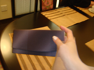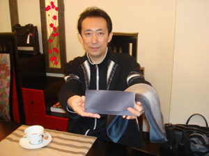 今日、3月に行う呉服の展示会の商品説明会があり、朝一番に着物染色家の「杉本正博先生」から「シルクオーガンジーのショール」と「漆染めの財布」を頂いてしまいました。「これ僕のオリジナル・・・というか、奥さんの為に作りました」