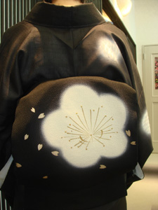 そう考えたあげく「大島紬・刺繍の黒の訪問着」にしました。帯は毎年今の季節になるとワクワクして結んでいる「黒のちりめん地に梅の柄の名古屋帯」。黒の着物に黒の帯の組み合わせは、若奥の大得意とするなコーディネートです。着物にも帯にも「白」しか色が使ってないので、帯揚も帯〆も帯留めも半衿も草履も、そしてピアスもマニキュアも・・・あえて「白」にしました。でも・・・バックはいつもの「黒のシャネル」。(シャネルのバックについてのこだわりは・・・また次回に・・・)