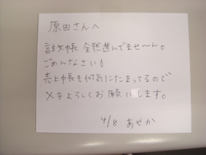 推薦だったので春休みが長く、自動車学校通いがメインで、高校の部活にも時々顔を出していて、とても忙しい毎日。それでも人並みに「アルバイトがしたい」と言う事で・・・。なにせ…「スーパー箱入り娘」なのでアルバイト禁止。その代わりに川平屋の経理を手伝う…と言う事で、簡単な事務仕事をしています。